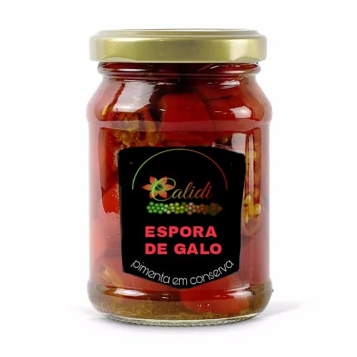 CONSERVA PREMIUM DE PIMENTAS BRASILEIRAS ESPORA DE GALO, conserva preparada com Pimentas Espora de Galo, considerada uma variedade silvestre em extinção, resgatadas da cultura mineira, com frutos vermelhos quando maduras, formato alongado que remetem a espora de galo; inteiras, selecionadas, frescas, colhidas e processadas in natura, sem conservantes, sem corantes, conservadas apenas em vinagre e sal, mantendo suas características de sabor delicado e aromático e de bela cor e textura